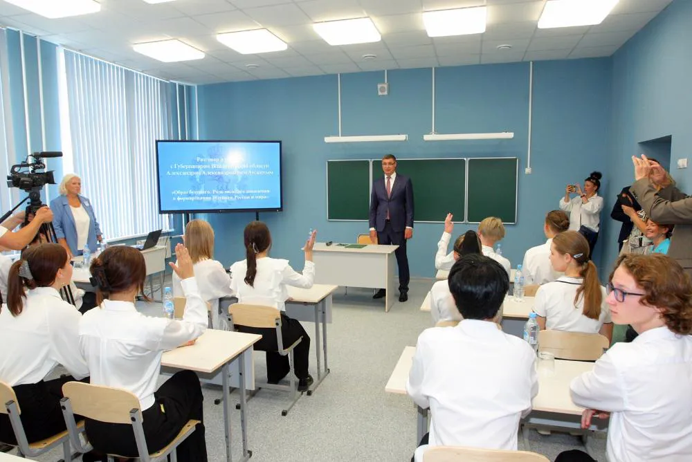 После торжественной линейки Александр Авдеев в формате диалога провёл Урок о важном для десятиклассников на тему «Образ будущего. Роль молодого поколения в формировании будущего России и мира».