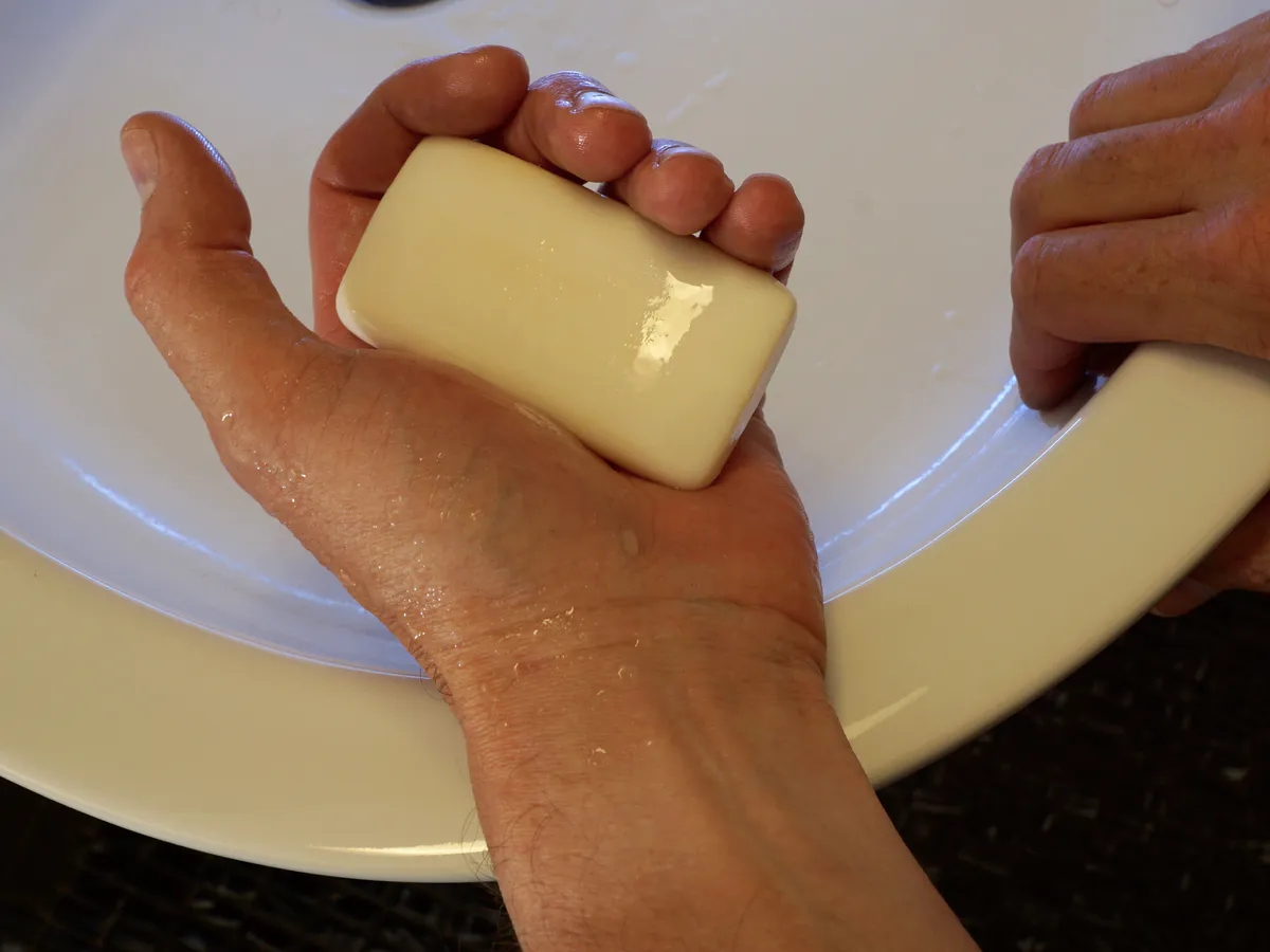 Для приготовления раствора нужно натереть половину бруска хозяйственного мыла на мелкой терке и растворить его в небольшой кастрюле с водой на слабом огне. В другом сосуде растворите несколько кристаллов марганцовки, а затем объедините оба раствора. Полученную смесь можно разбавить водой и использовать для замачивания загрязненных вещей.