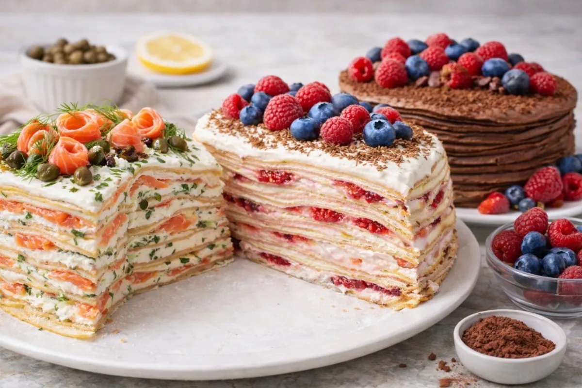 Обычные тонкие блины можно превратить в эффектный торт, который режется красивыми слоями и выглядит как настоящий праздничный десерт. Не стопка на тарелке, а полноценное угощение, которое хочется подать гостям. Причём существует несколько версий – солёная с рыбой и сладкие с ягодами.
