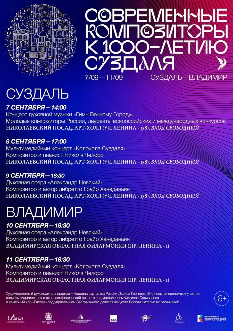 Композитор и автор либретто оперы «Александр Невский»- профессор Санкт-Петербургской консерватории имени Н.А Римского-Корсакова Грайр Ханеданьян, фортепианный цикл «Колокола Суздаля» написан композитором и пианистом, выпускником Высшей Национальной консерватории Парижа и консерватории Версаля Николя Челоро. Лауреаты Всероссийского конкурса «Партитура» и «АртМастерс» представят на молитвы и тропари суздальским святым.