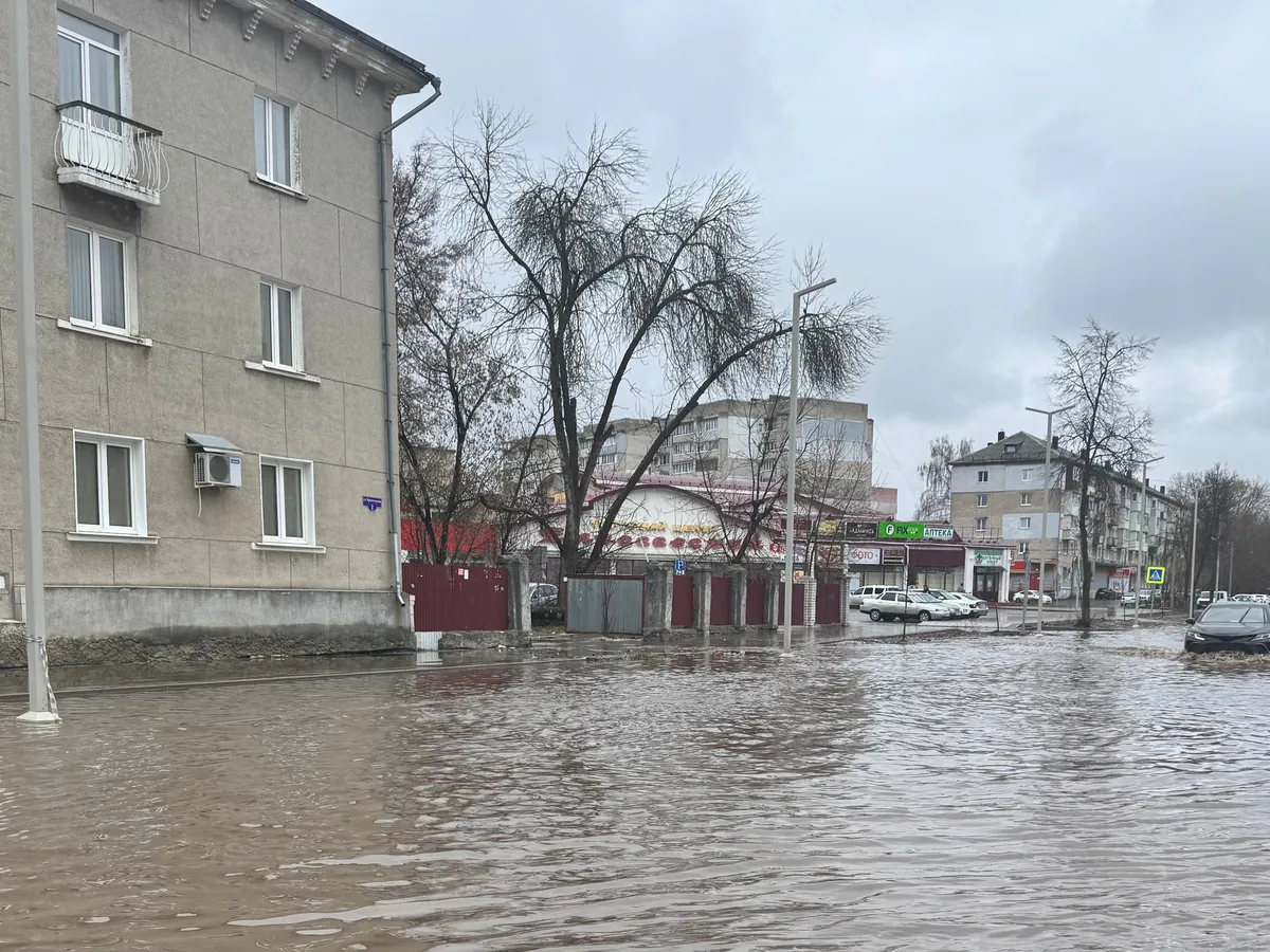 Из-за весеннего половодья проезжая часть и тротуар оказались под водой, движение транспорта и пешеходов было серьезно затруднено.