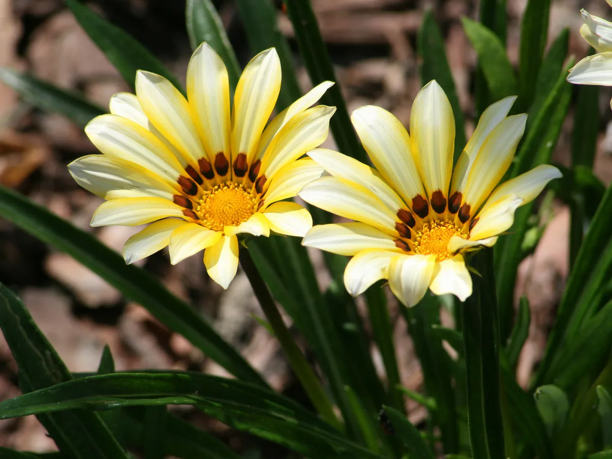 Цветки газании напоминают большие ромашки с лучистыми лепестками, окрашенными в яркие и насыщенные оттенки. Вы можете наслаждаться красочными цветами — от огненно-красных и солнечно-желтых до нежных белых и ярких оранжевых. Узкие, вытянутые листья растения, насыщенные зеленью, служат отличным фоном для этих великолепных соцветий, создавая гармоничную композицию.
