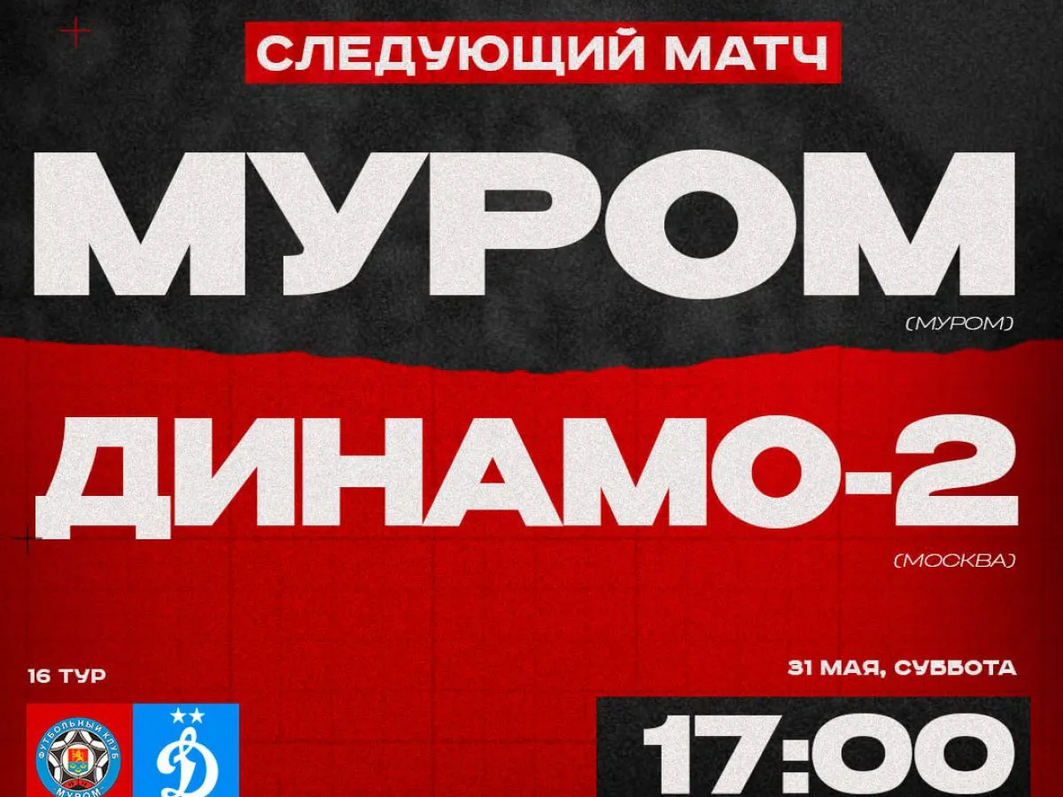 Уже сегодня, 31 мая, на стадионе “Имени Виктора Лосева” футболисты «Мурома» встретятся с московскими «Динамо-2». Матч пройдет в рамках 16-го тура Второй лиги (дивизион А).