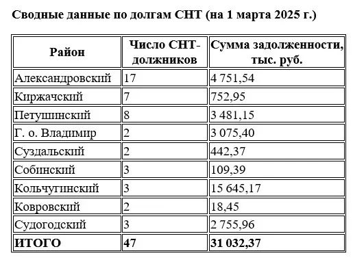 Самый серьёзный объём долга сосредоточен в Кольчугинском районе – свыше 15,6 млн рублей (при этом должников там всего три товарищества). На втором месте по объёму непогашенных платежей идёт Александровский район с суммой в 4,75 млн рублей (должников там 17), за ним – Петушинский район (3,48 млн рублей, 8 СНТ). В самом областном центре задолженность двух товариществ тянет почти на 3,1 млн рублей.