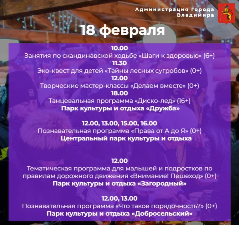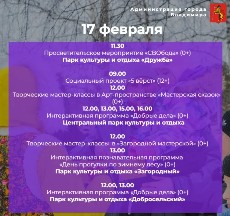 В мэрии Владимира опубликовали афишу мероприятий на выходные дни - 17 и 18 февраля. Все мероприятия пройдут в городских парках.