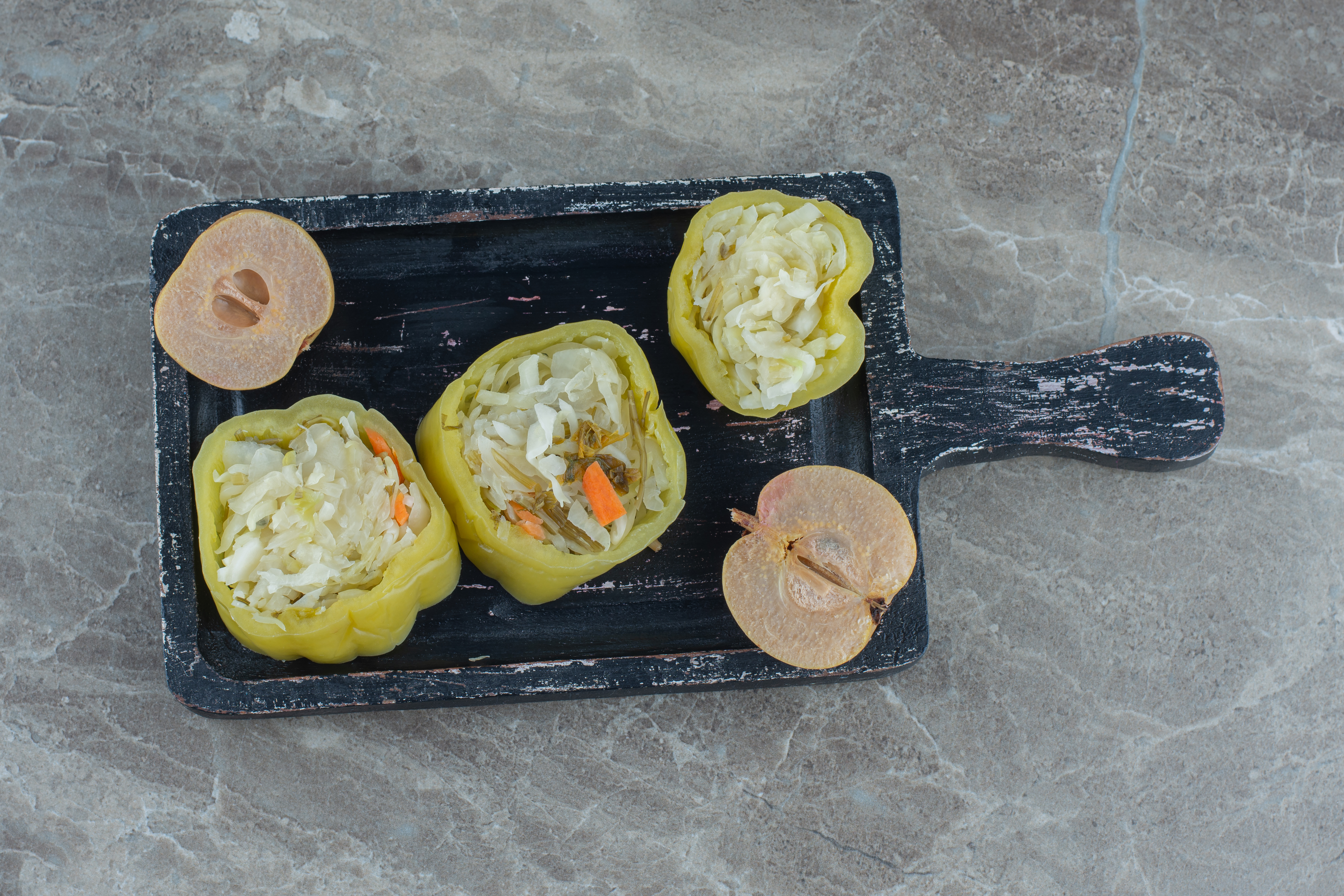 Первым делом аккуратно очищаем сладкий перец от семян и внутренних перегородок, стараясь не повредить стенки. Затем опускаем его в кипящую воду буквально на пару минут — это поможет сделать перец более податливым. После этого выкладываем перцы на полотенце, чтобы они обсохли и остыли.