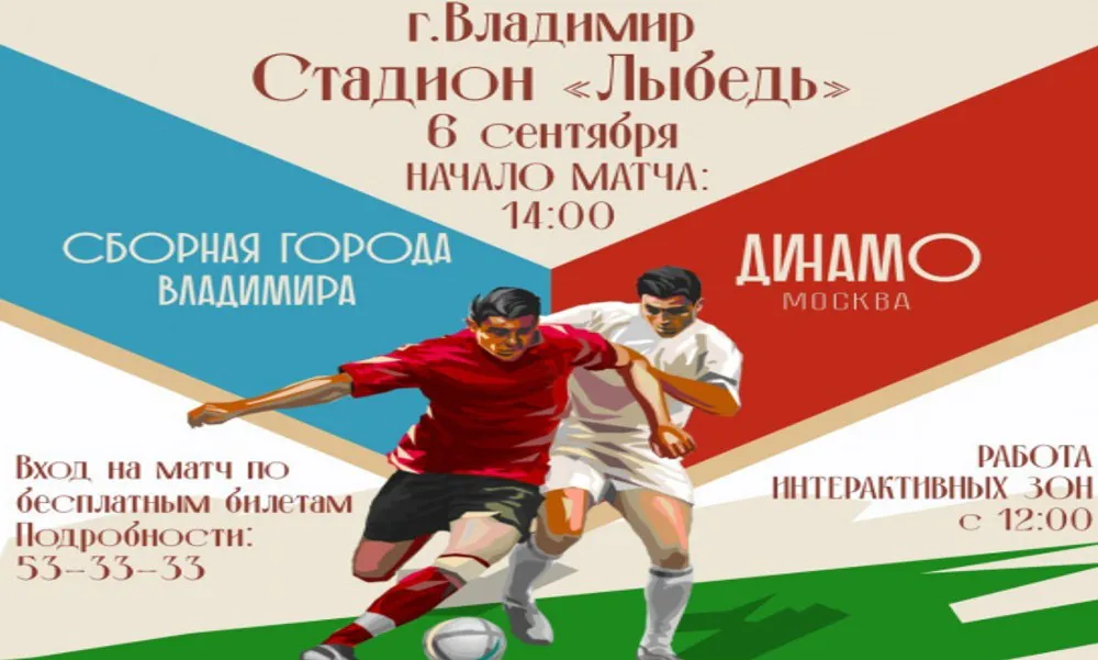 В эту субботу стадион «Лыбедь» станет главной спортивной площадкой города – здесь пройдёт «Матч Победы», сообщила администрация Владимира. На поле выйдут ветераны московского «Динамо» и сборная областного центра, куда войдут сотрудники правительства региона, представители мэрии, депутаты и предприниматели.