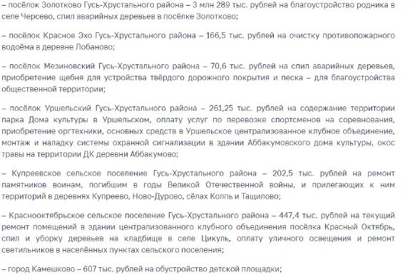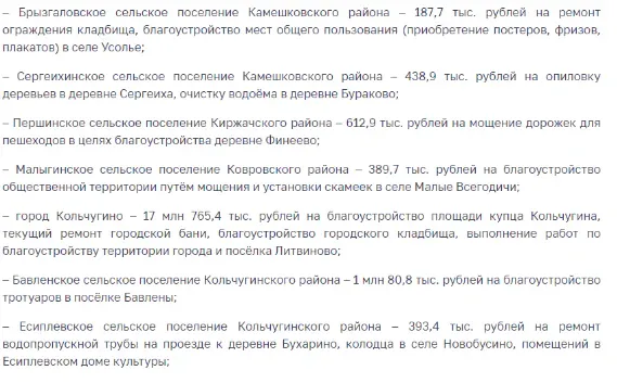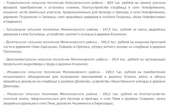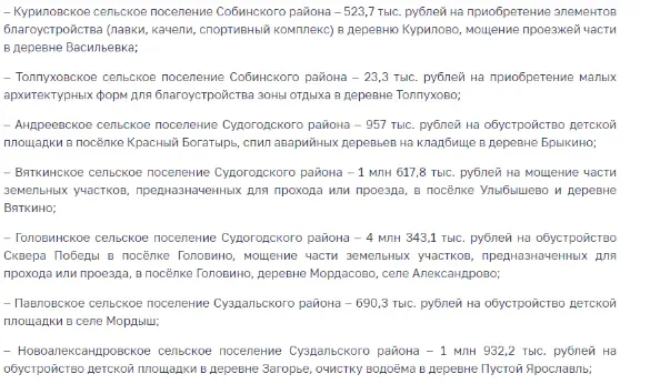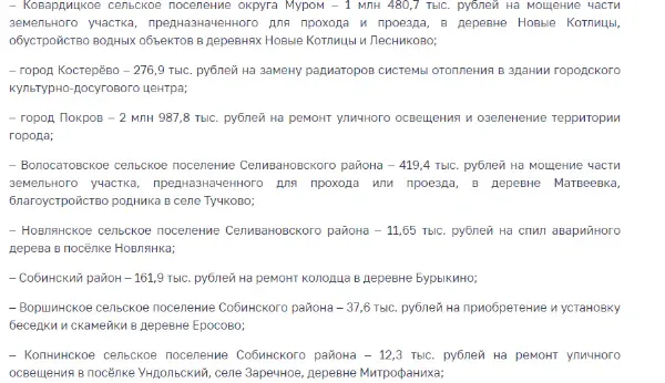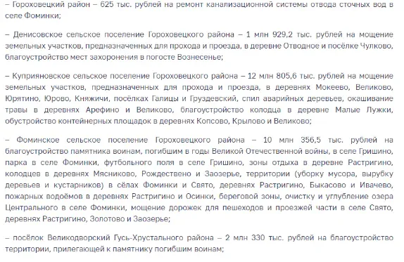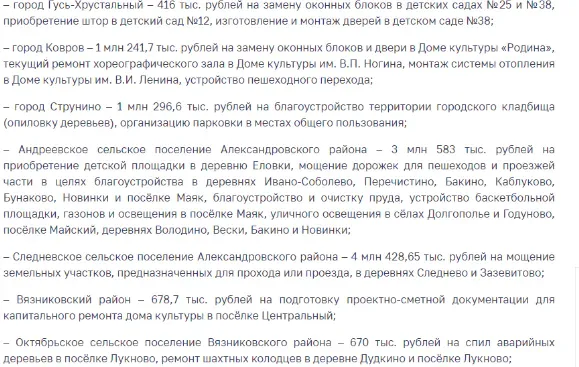 Участниками программы софинансирования инициатив селян стали 50 муниципалитетов Владимирской области. В них собрали в виде добровольных взносов почти 35,5 миллиона рублей. При этом областная дотация превысила 82,6 миллиона рублей.