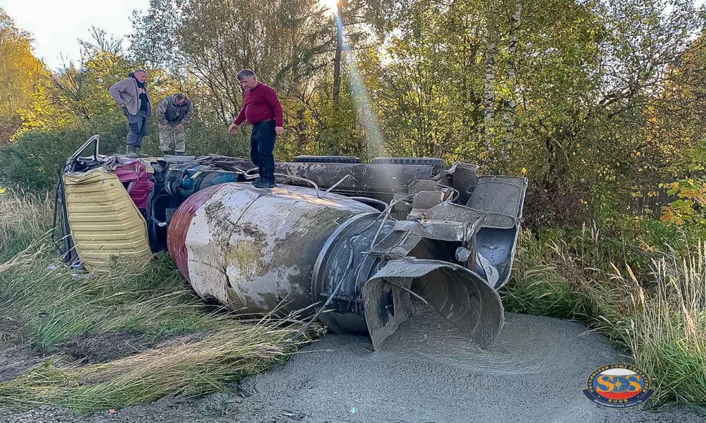 Когда спецмашины прибыли к месту происшествия, они увидели бетономешалку, съехавшую с трассы в кювет. Кабина была сильно повреждена, водитель оказался заблокирован внутри.