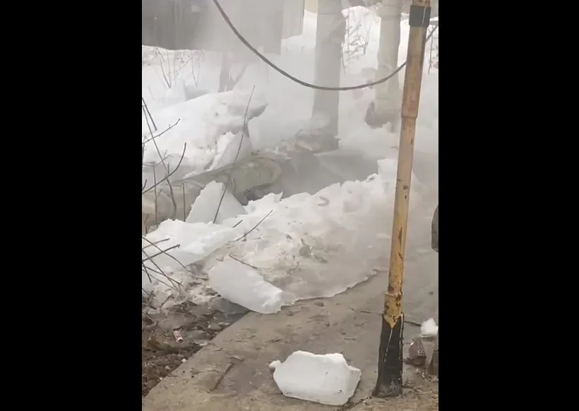 На улице Алябьева лед с крыши дома проломил трубу теплотрассы