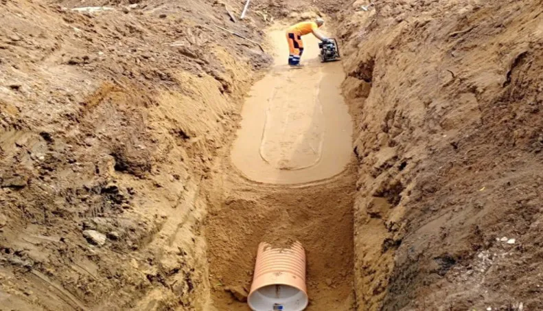 На всём протяжении будущей дороги завершена прокладка магистральной трубы. Сейчас работы сосредоточены вблизи дома №12г по улице Стрелецкой, где идёт монтаж водопропускных труб.