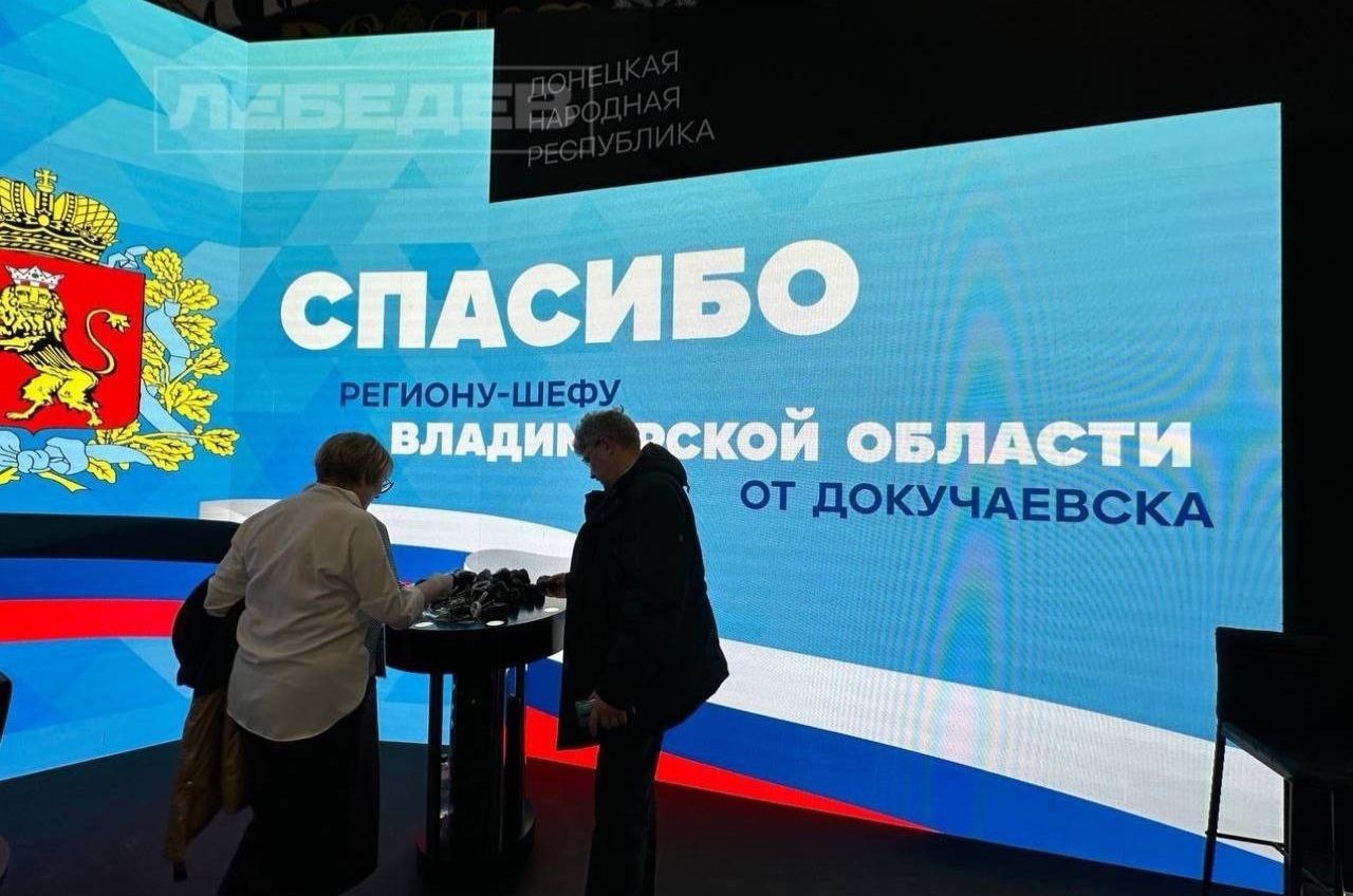 На выставке-форуме "Россия" в Владимирской области стенд Донецкой Народной Республики (ДНР) получил заставку с благодарностью от города Докучаевска. Там называют Владимирскую область "регион-шефом".
