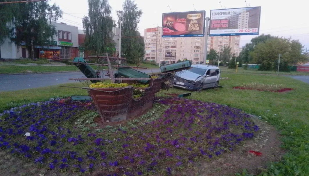 В результате аварии пострадала городская клумба: легковушка снесла стойку с подвесными кашпо, а цветочная композиция в виде корабля получила серьёзные повреждения.