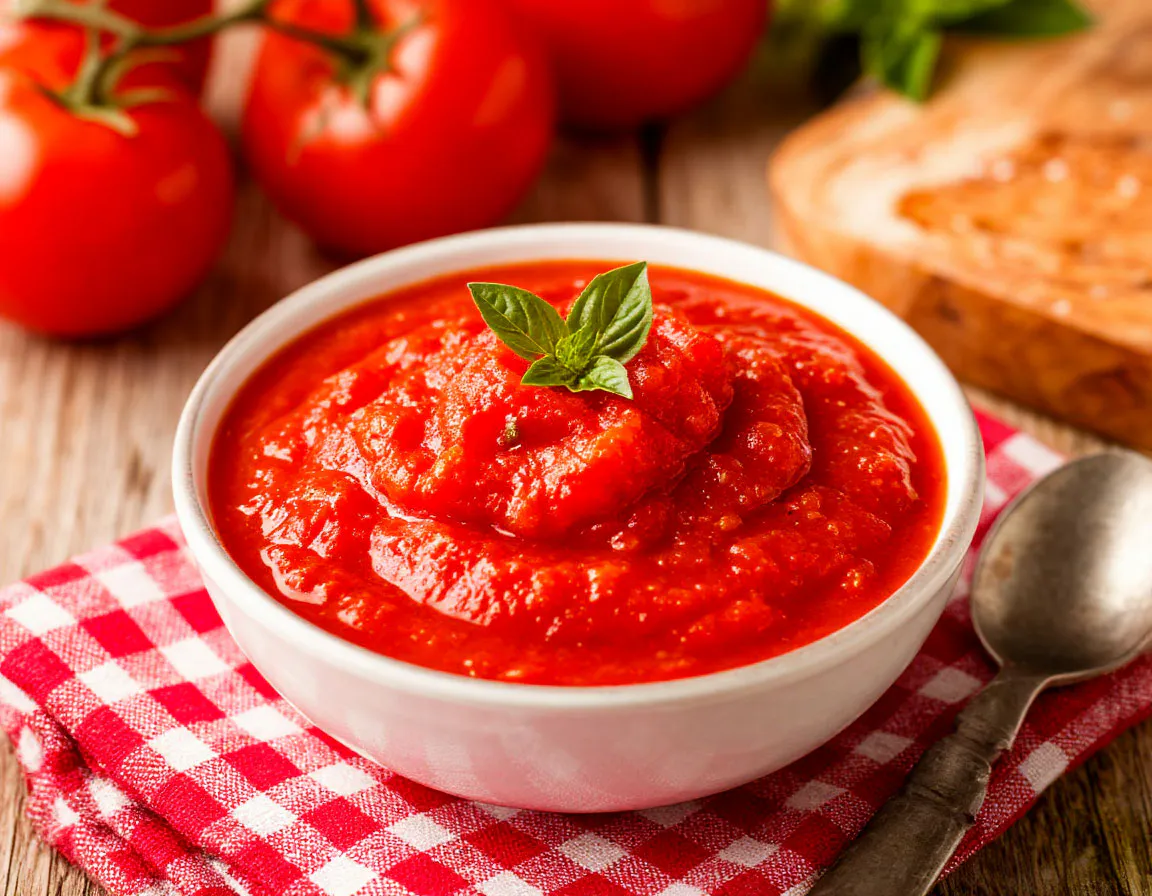 Основа вкуса — спелые, мясистые помидоры насыщенного красного цвета. Они дают соусу не только яркий оттенок, но и ту самую густую, бархатистую текстуру. Кстати, хвостики можно не обрезать — всё равно потом будем перетирать массу через сито.