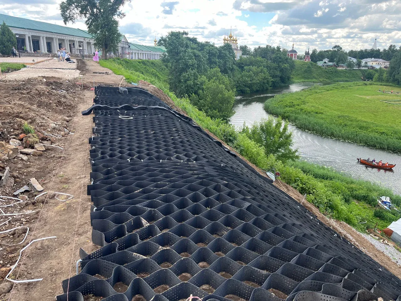 «Ведется берегоукрепление в районе Кабацкой горы - смонтированы винтовые сваи, уложены габионы, сверху укладывается георешетка, которая засыпается грунтом для роста травы. Данная методика сохранения склонов была применена по высокому берегу реки Каменка сзади Спасо-Евфимиева монастыря и дала хорошие результаты», - пишут в суздальской подслушке».