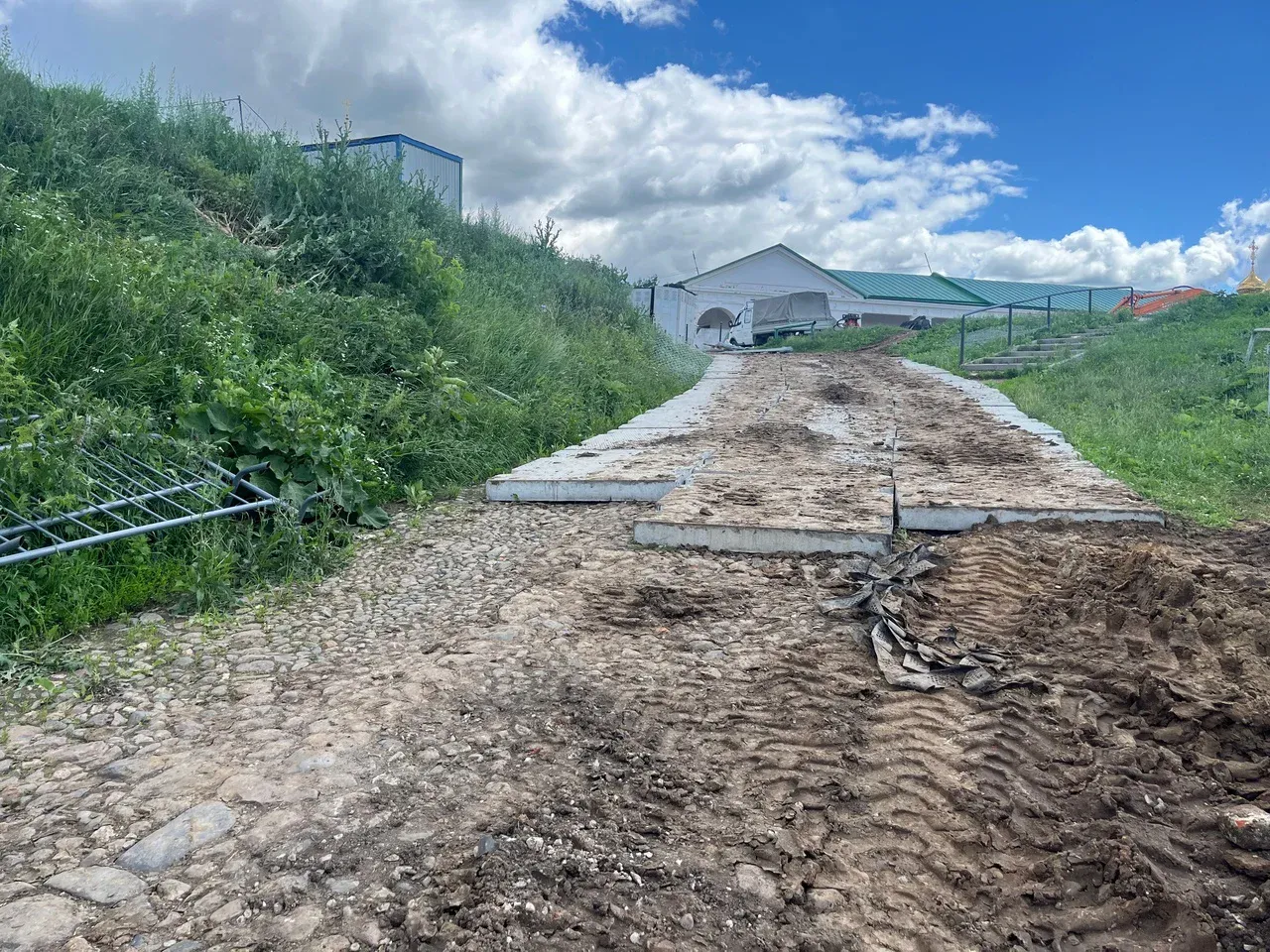Для сохранения мощеной булыжником дороги от смотровой площадки на улицу Слободская (в связи с работой тяжелой техники на Кабацкой горе) подрядчик временно уложил бетонные плиты. Позднее они будут сняты.