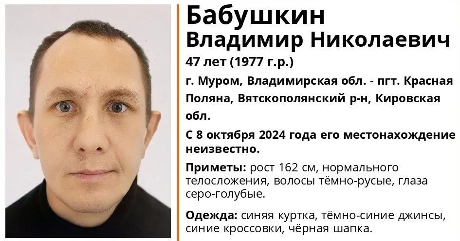 В Муроме разыскивают 47-летнего Владимира Бабушкина, пропавшего в октябре 2024 года. Известно, что мужчина мог направляться в посёлок Красная Поляна Вятскополянского района Кировской области, однако с 8 октября его местонахождение остаётся неизвестным.