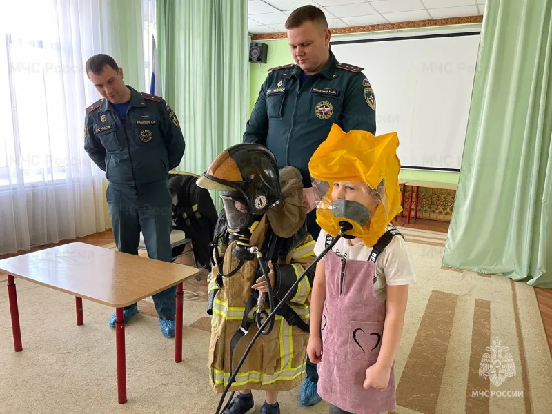 Сотрудники МЧС России продемонстрировали ребятам свою специальную экипировку, используемую для борьбы с огнем, включая дыхательные аппараты. Детям была предоставлена возможность примерить элементы боевой одежды пожарных, что вызвало у них большой восторг.