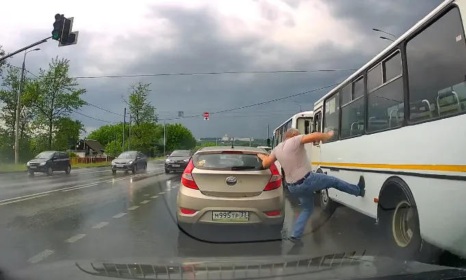 Разъяренный водитель авто испинал автобус в Загородном