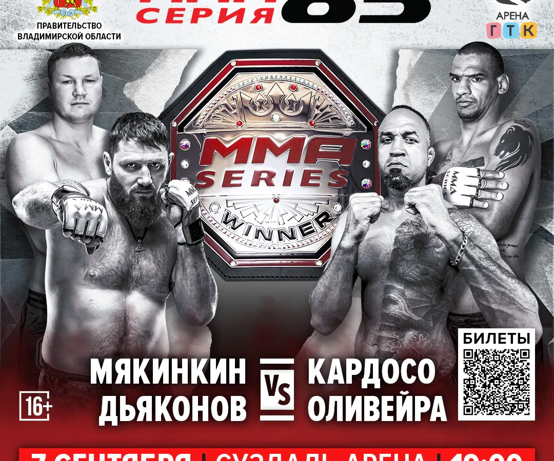 7 сентября в спортивном центре «Суздаль Арена» пройдёт турнир ММА Серия-83. Популярные атлеты высочайшего класса проведут 10 поединков. Главным событием вечера станет бой богатыря из Мурома – единственного обладателя платинового пояса Победителя ММА Серии - Сергея Дьяконова с бразильцем Эдинальдо Оливейрой.