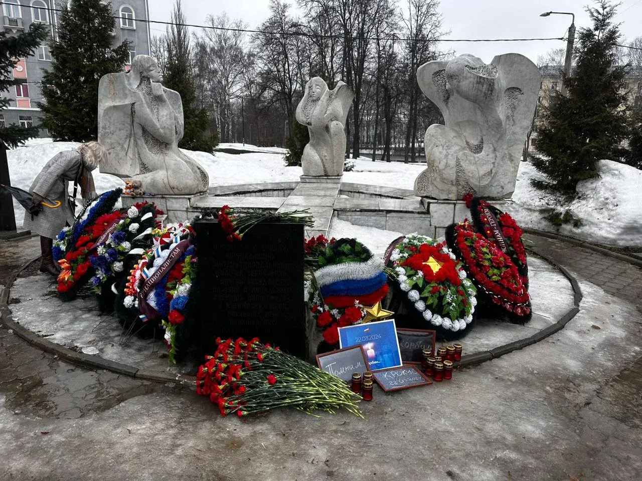 Со вчерашнего дня в память о погибших и в знак солидарности со всеми жертвами страшной трагедии в Подмосковье жители Владимира несут к Вечному Огню и мемориалу «Скорбящие ангелы» на Октябрьском проспекте цветы, игрушки, венки, лампадки, таблички с надписями «Скорбим», «Помним», «Крокус». Во Владимире в знак скорби о погибших приспущены флаги над административными зданиями. На уличных экранах и в общественном транспорте транслируют видео со свечой и надписью «Скорбим 22.03.2024». Все городские развлекательные и культурно-массовые мероприятия отменены. - глава города Владимира Дмитрий Наумов