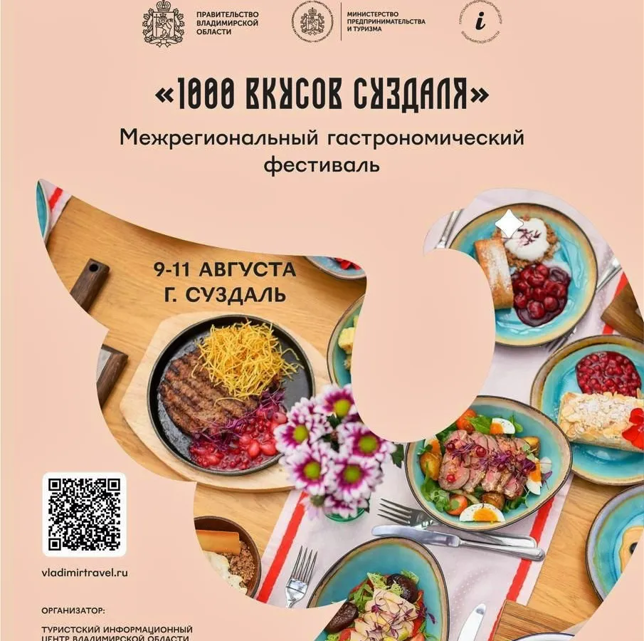 Праздничная афиша юбилея горда-музея продолжает пополняться новыми подробностямизапланированных мероприятий. Для любителей ярких кулинарных блюд точно будет интересен Межрегиональный гастрономический фестиваль «1000 вкусов Суздаля». Он будет ждать гостефй на праздничной поляне на территории ГТК (10 августа), в сквере Художников у Торговых рядов (9, 10, 11 августа), на парковке возле Пятницкой церкви (9, 10, 11 августа) и на площади возле Дома культуры (9, 10, 11 августа).