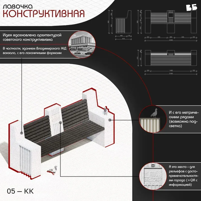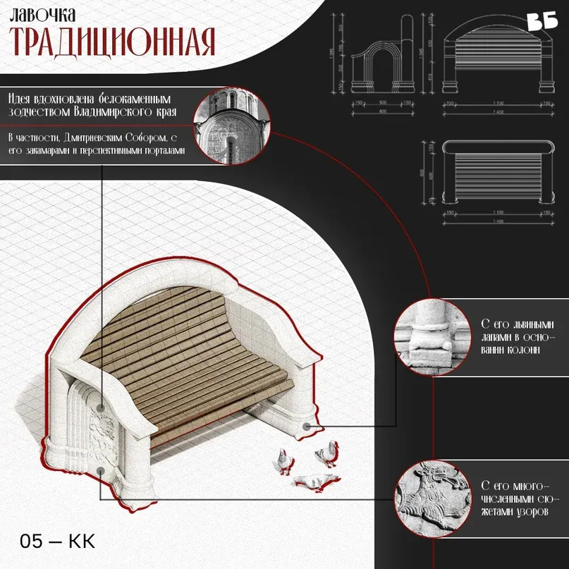 В январе общественное движение «Владимир будущего» совместно с дизайн-бюро «Четыре» провели конкурс концепций фирменнной уличной скамейки для Владимира и его районов.