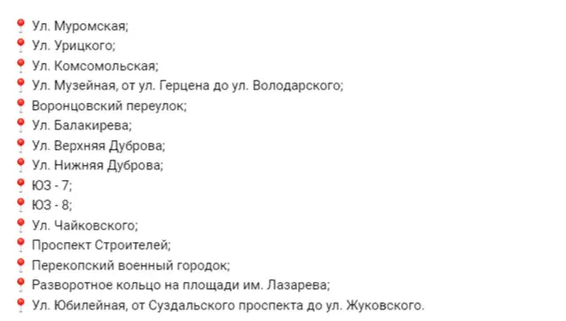 Список улиц, с которых нужно убрать автомобили: