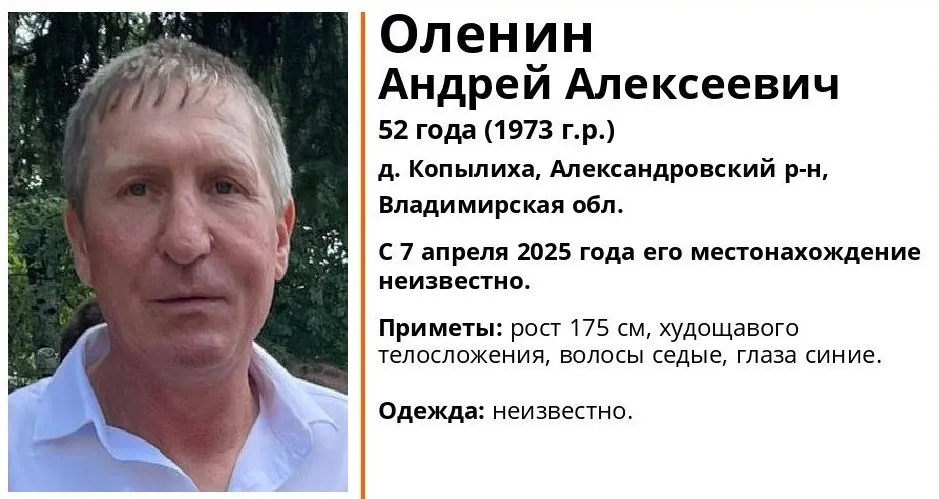Во Владимирской области проходят поиски 52-летнего жителя деревни Копылиха Александровского района. Как сообщил поисковый отряд «ЛизаАлерт» региона, Оленин Андрей Алексеевич пропал 7 апреля 2025 года. С того дня его местонахождение остаётся неизвестным.