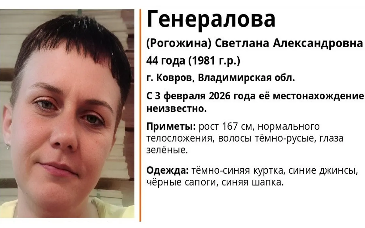 С 3 февраля 2026 года в Коврове проходят поиски 44-летней Светланы Александровны Генераловой (Рогожиной). Женщина не выходит на связь с близкими, и её местонахождение до настоящего времени неизвестно.