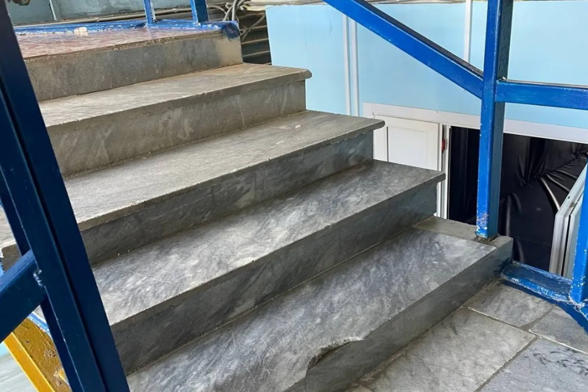 Во время осмотра выяснилось, что пол в спортивном зале находится в плохом состоянии. Поверхность повреждена, из-за чего её сложно нормально мыть и содержать в чистоте. Такая же ситуация сложилась с лестницей в холле – она тоже требует ремонта и обновления. Эти зоны ежедневно используют дети, и состояние покрытий не соответствует элементарным требованиям безопасности и гигиены.