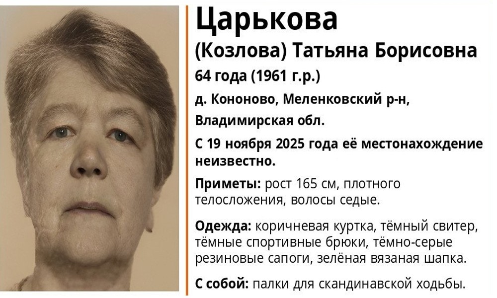 Поисковый отряд «ЛизаАлерт» Владимирской области объявил поиски 64-летней Татьяны Борисовны Царьковой (в девичестве Козловой), которая пропала 19 ноября в деревне Кононово Меленковского района. С того дня её местонахождение остаётся неизвестным, и сейчас к поискам подключаются добровольцы со всего региона.