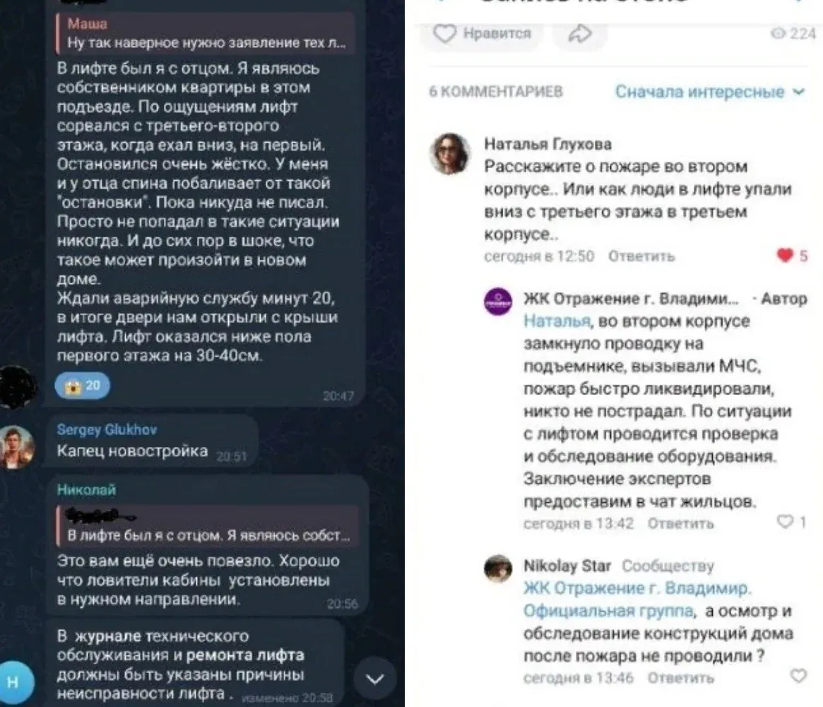 4 корпуса ЖК «Отражение» построены компанией «Монострой». Корпус, в котором сорвался лифт, сдали еще в конце прошлого года, но с большой задержкой. Как только жильцы получили ключи от своих новых квартир, то столкнулись еще с массой проблем. Некоторых жильцов дома заливало по 3-4 раза в месяц. Из-за этого стены дома покрывались инеем, а внутри квартир держалась минусовая температура. По словам местных жителей, температура в стояках на первом этаже новостройки была всего 40 градусов, когда должна быть 60. Некоторые стояки в доме вообще не работают.
