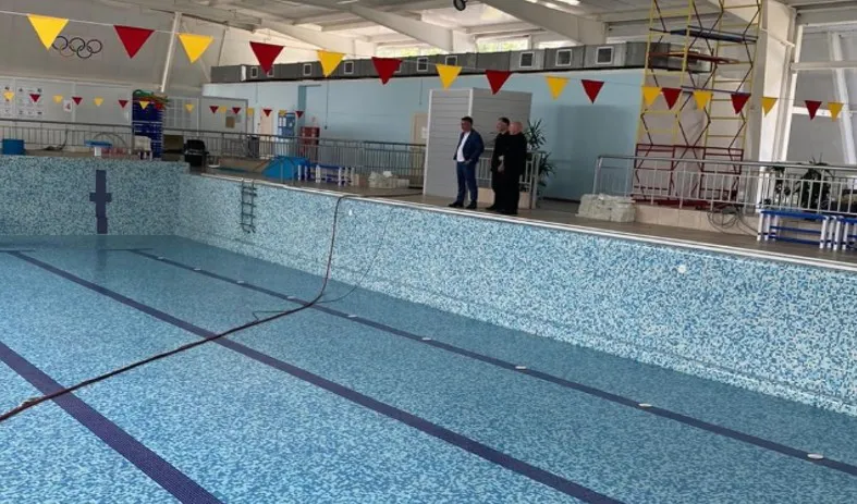 В основном здании спорткомплекса уже завершается покраска пола в зале, идёт санитарная обработка чаши бассейна. В мужской раздевалке укладывают новую плитку, параллельно специалисты ремонтируют вентиляцию.
