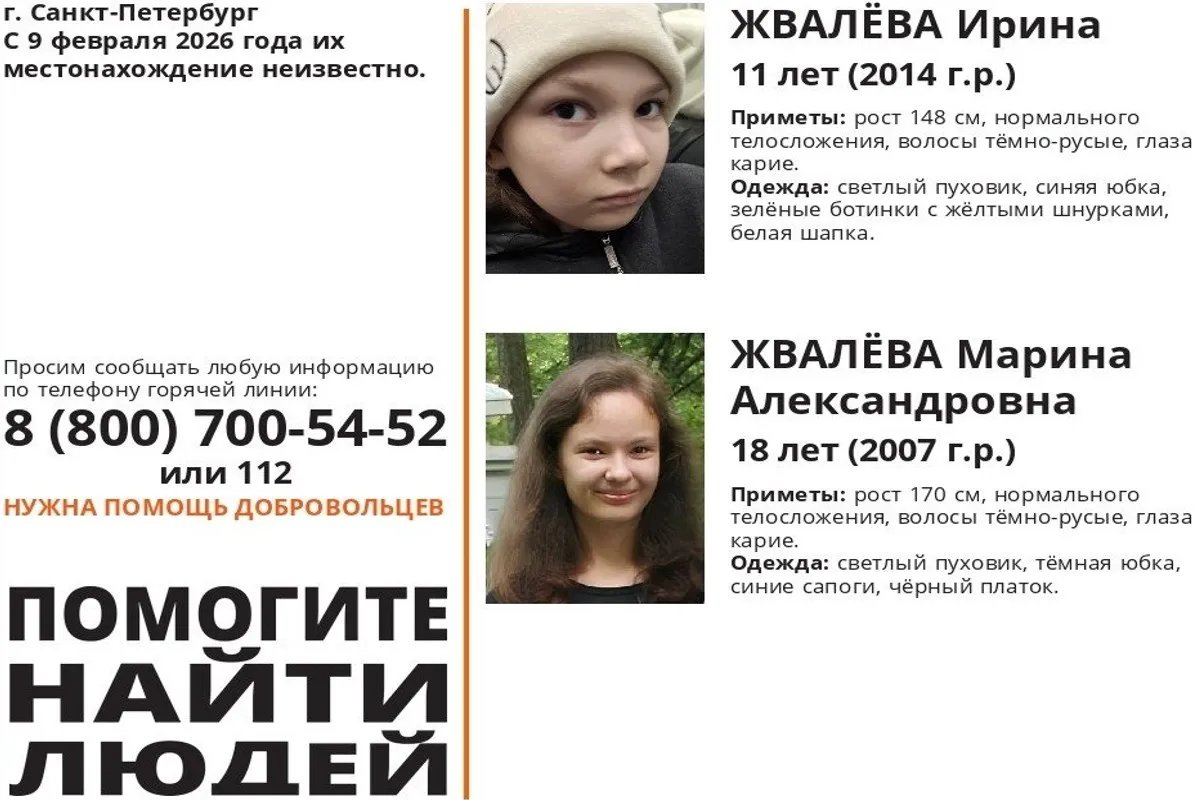 Во Владимирской области разыскивают 2 жительниц Санкт-Петербурга – 11-летнюю Ирину Жвалёву и 18-летнюю Марину Александровну Жвалёву. С 9 февраля 2026 года их местонахождение неизвестно. По имеющейся информации, девушки могут находиться на территории региона.
