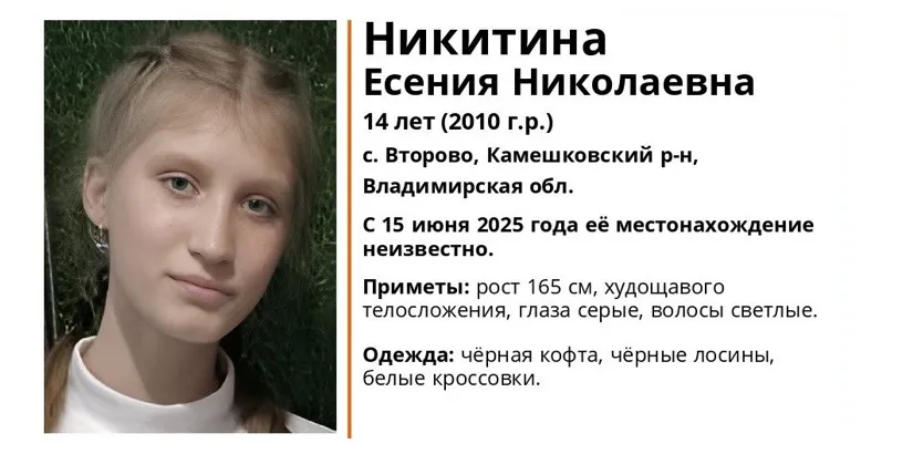 Поисковый отряд «ЛизаАлерт» Владимирской области обращается за помощью в поиске подростка. Разыскивается 14-летняя Есения Николаевна Никитина, жительница села Второво Камешковского округа.