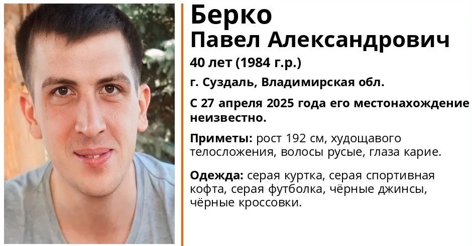 Поисковый отряд «ЛизаАлерт» Владимирской области сообщил о розыске Берко Павла Александровича, 1984 года рождения. Мужчина пропал 27 апреля 2025 года в городе Суздаль, с тех пор его местонахождение остаётся неизвестным.
