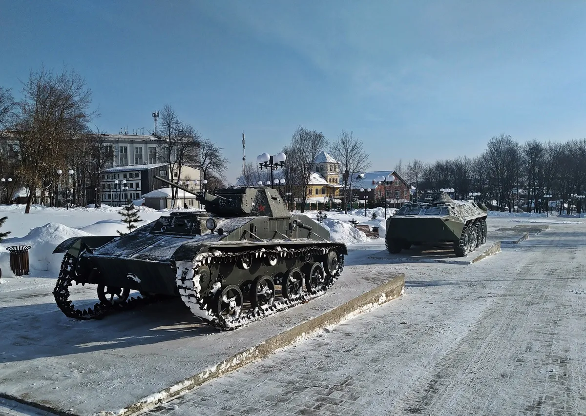До этого в сквере были установлены легендарная «полуторка», грузовик ГАЗ-АА, гаубица Д-30 и дивизионная противотанковая пушка. Теперь экспозицию дополнили танк и БТР.