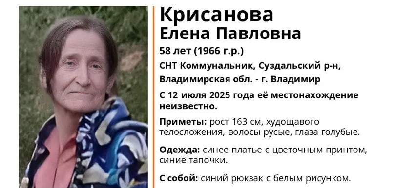 Во Владимирской области продолжаются поиски 58-летней Елены Павловны Крисановой. Женщина пропала 12 июля в СНТ «Коммунальник» Суздальского района и с тех пор о ней ничего не известно. Об этом сообщил поисковый отряд «ЛизаАлерт» региона.