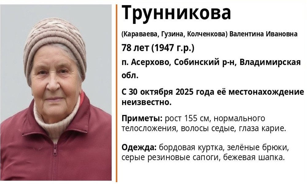 Владимирские поисковики из отряда «ЛизаАлерт» объявили срочный выезд – пропала 78-летняя Валентина Ивановна Трунникова из посёлка Асерхово в Собинском районе. Женщина нуждается в медицинской помощи, и сейчас каждая минута может быть решающей.