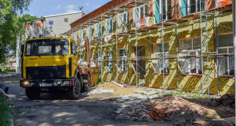 Уже заменили окна и обустроили отмостки, а сейчас ремонтируют фасад, кровли и внутренние помещения. Также проводят электромонтажные работы.