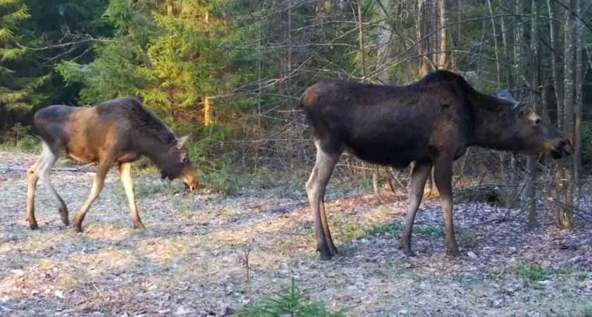 В объектив Дирекции ООПТ Владимирской области попала самка лося со своим детенышем в Клязьминско-Лухском заказнике. По словам специалистов, лоси не расстаются с матерями до того, пока им не исполнится примерно год. Подросшего детеныша самка агрессивно отгоняет от себя примерно за 1-2 недели до появления на свет других малышей, старшему остается только уйти.