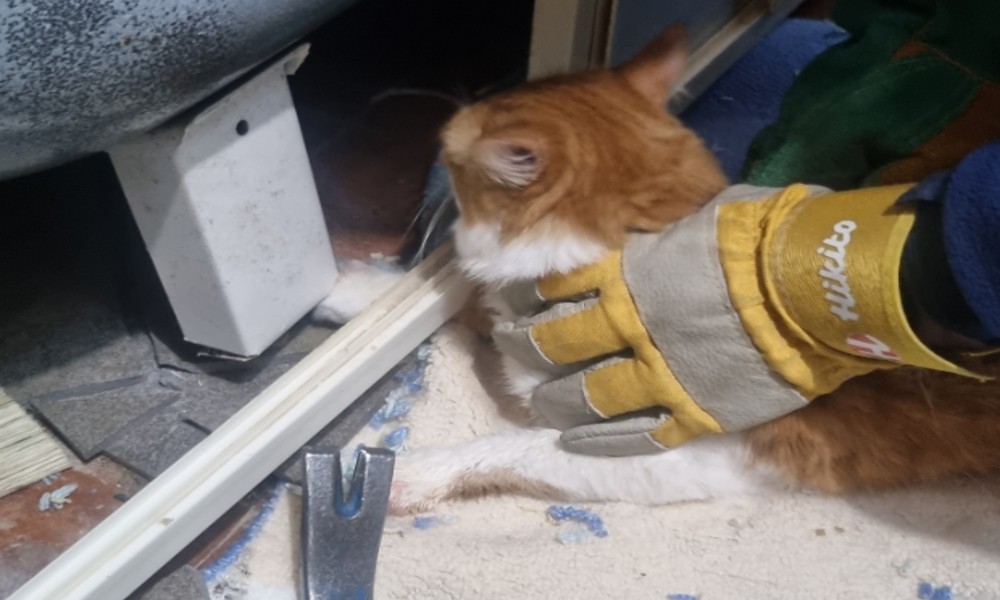 Спасатели приехали быстро. Пришлось работать почти двадцать минут: металл держал крепко, и просто поднять или сдвинуть ножку ванны не выходило. В итоге они аккуратно согнули опору настолько, чтобы освободить маленького пленника.
