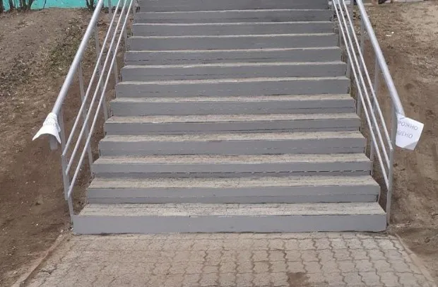 Работы включали восстановление металлического каркаса спуска, полную замену плиточного покрытия ступеней, а также обновление прилегающих площадок. Особое внимание уделили безопасности – металлические поручни были тщательно очищены от ржавчины и старой краски, после чего их заново покрасили.