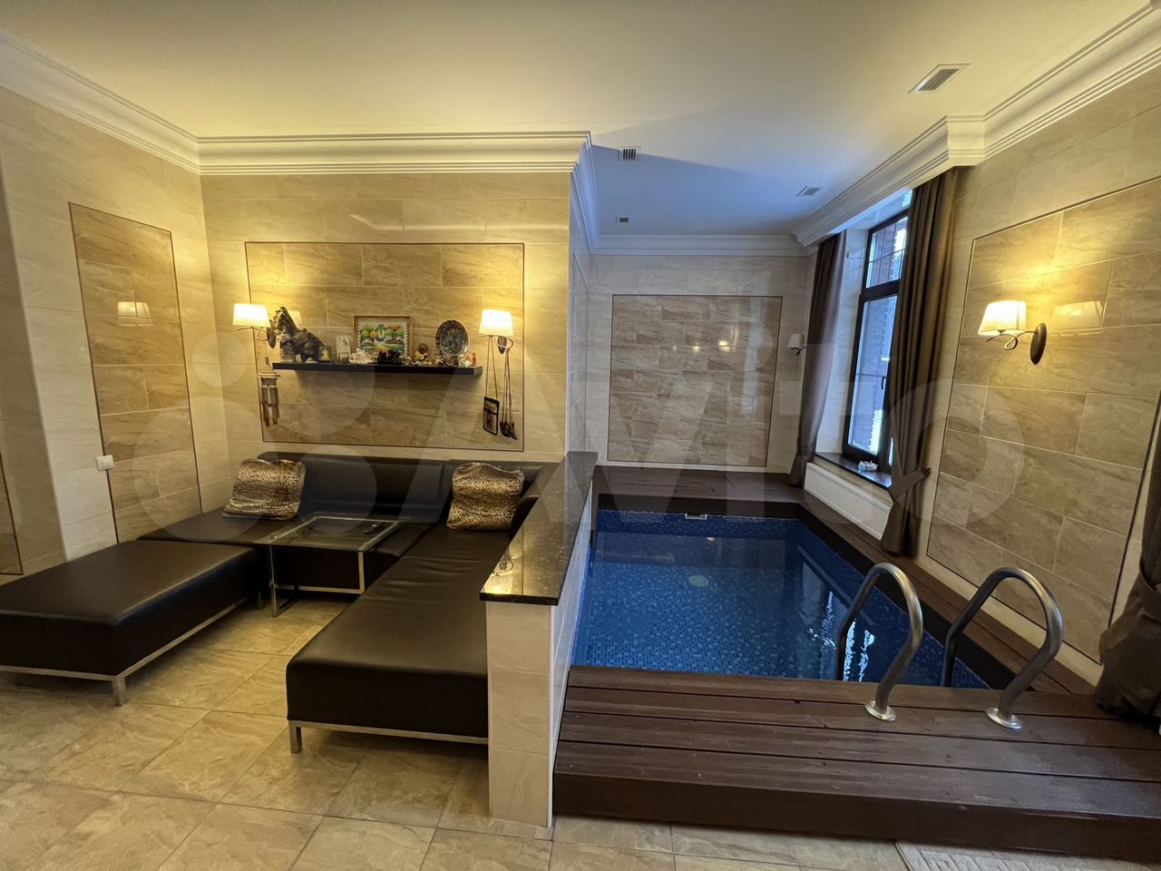 Размер дома — 951 кв. м. Дом с панорамным остеклением, в нем есть камин, сауна с деревянной топкой, бассейн, две гардеробные комнаты. Есть отапливаемый гараж на два автомобиля, дополнительная парковка на участке, собственная газовая котельная и автоматические ворота.