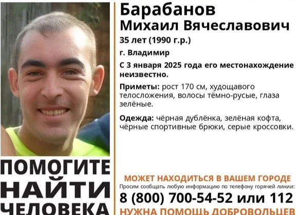 Во Владимире ведутся поиски 35-летнего Михаила Вячеславовича Барабанова, который пропал 3 января 2025 года. Его местонахождение до сих пор неизвестно.