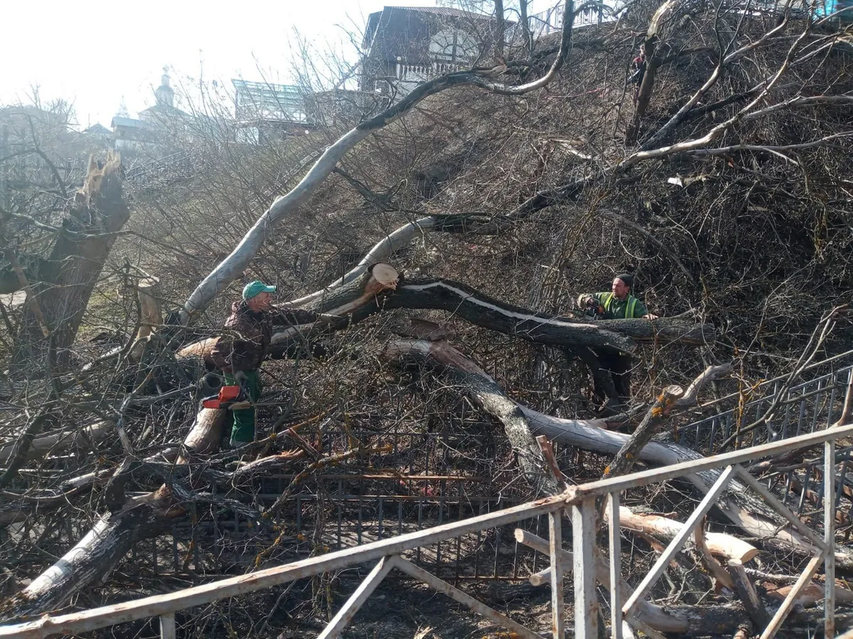 В Центральном парке рухнули 4 дерева. Сейчас городские службы распиливают деревья и убирают их.