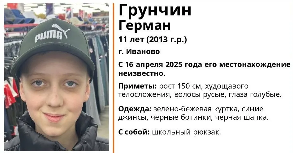 С 16 апреля 2025 года неизвестна судьба 11-летнего Германа Грунчина из города Иваново. Его местоположение остаётся неустановленным, подростка ищут добровольцы и полиция.