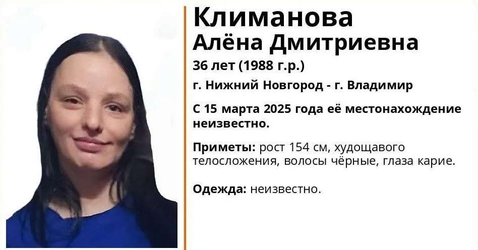 Поисковый отряд «ЛизаАлерт» Владимирской области сообщил о розыске 36-летней жительницы Нижнего Новгорода. Климанова Алёна Дмитриевна перестала выходить на связь 15 марта 2025 года – с тех пор её местоположение остаётся неизвестным.