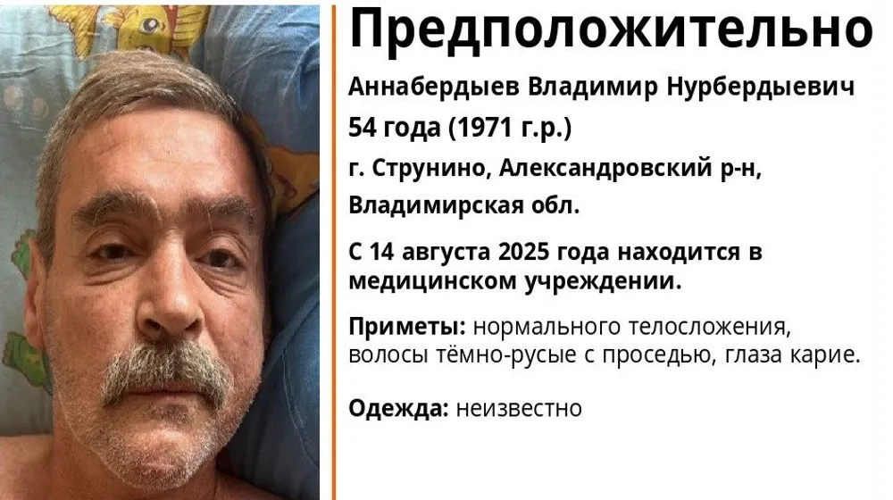 Речь идёт о Владимире Нурбердыевиче Аннабердыеве, 54 лет (1971 года рождения), из города Струнино Александровского района. Мужчина был доставлен в больницу 14 августа 2025 года.